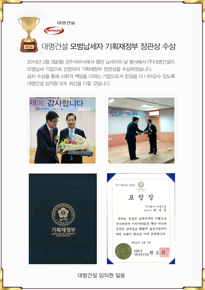 제목 대명건설 모범납세자 기획재정부 장관상 수상