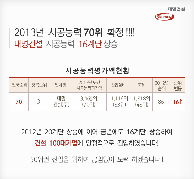 제목 [시공능력 상승] 2013년 시공능력 70위 확정!